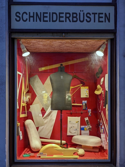 I came across a huge fabric shop - but it was outside of opening hours, much to the relief of my wallet. I enjoyed this window display though. Are those enormous hams? What is that gigantic cheese shaped thing?