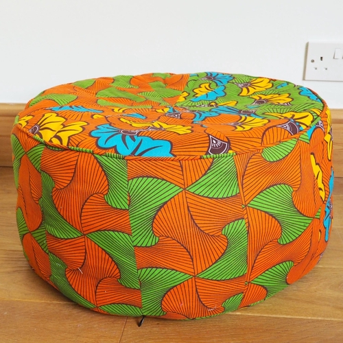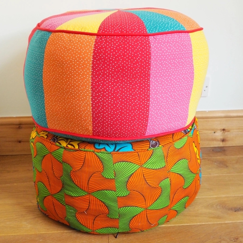 This pattern has been written about a lot in the sewing community, and is very well-loved. I completely understand why: not only do you end up with a fun and practical pouf (useful as a seat, a footrest, or a majestic throne for a cat) but it also scores very nicely in the sustainability department. It can be made from fabric scraps, and it can be stuffed full of whatever bits of fabric you have lying around - scraps, cutoffs, bits of thread or yarn, retired blankets, ancient towels, the ugly curtains that were hanging in your house when you moved in, ratty old faded knickers (clean ones!), etc. Each pouf holds an inconceivable amount of otherwise purposeless fabric.