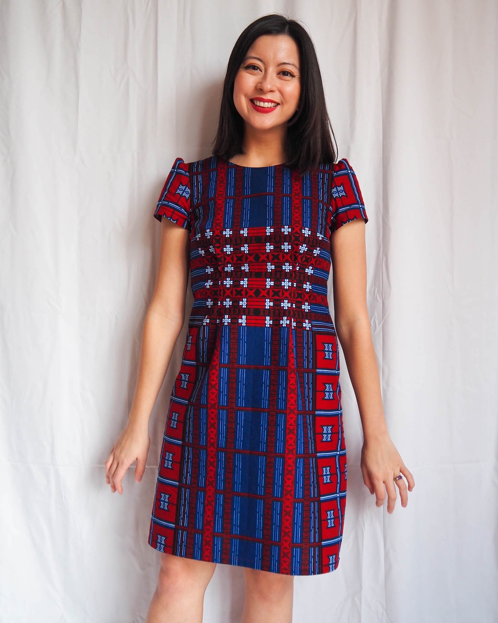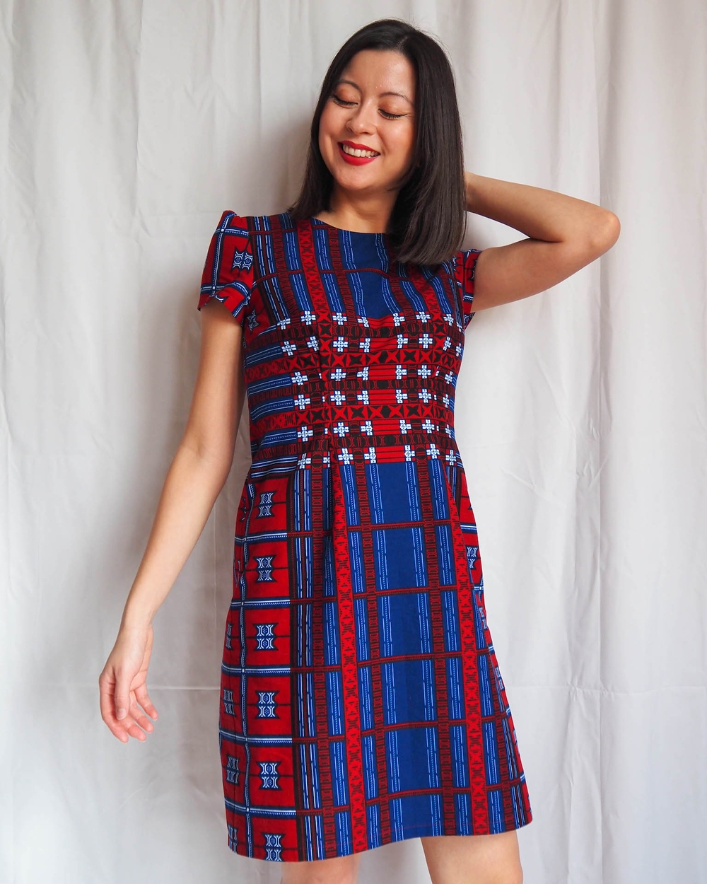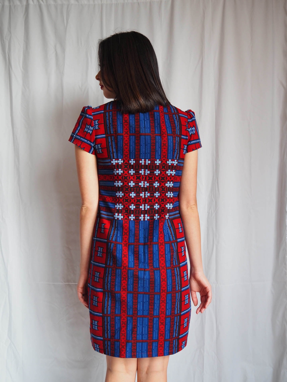 That’s actually one of my favourite things about African wax print fabric. It often has multiple design features along the length that you can get really creative with. I could make this same dress again out of the same fabric, but centre it on the red area instead of the blue, and the two dresses would look very different. Sisters, not twins.