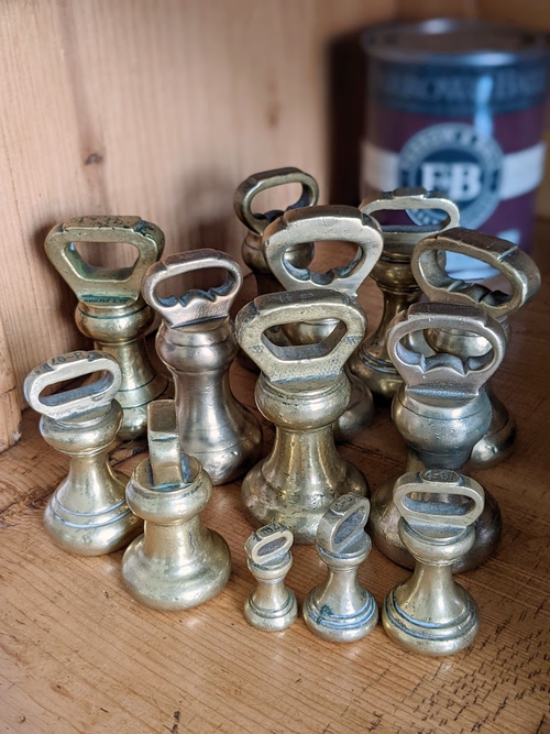 In other news, my pattern weight collection has expanded considerably this week. I use antique brass bell weights of 1lb or under, and my rule is that I can only buy them if I see them in person. I spotted four 1lb weights in the window of a local antique shop, and simply had to snap them up!