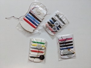 I often collect miniature mending kits from hotels and stash them in my handbags, because the time you need a mending kit is not when you are in a hotel room with your luggage – and therefore hopefully also with a spare change of clothes – but rather when you’re out and about, at a nice dinner, or in the office, with only the clothes on your back, and a significantly higher need to look presentable.